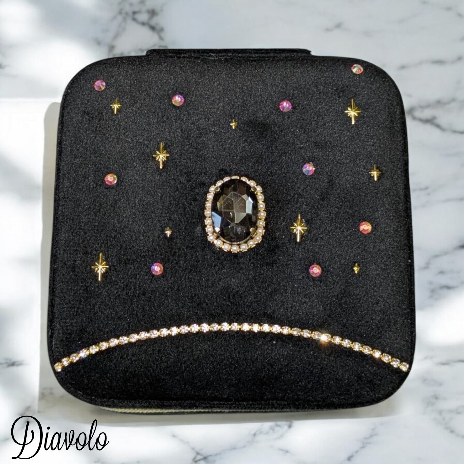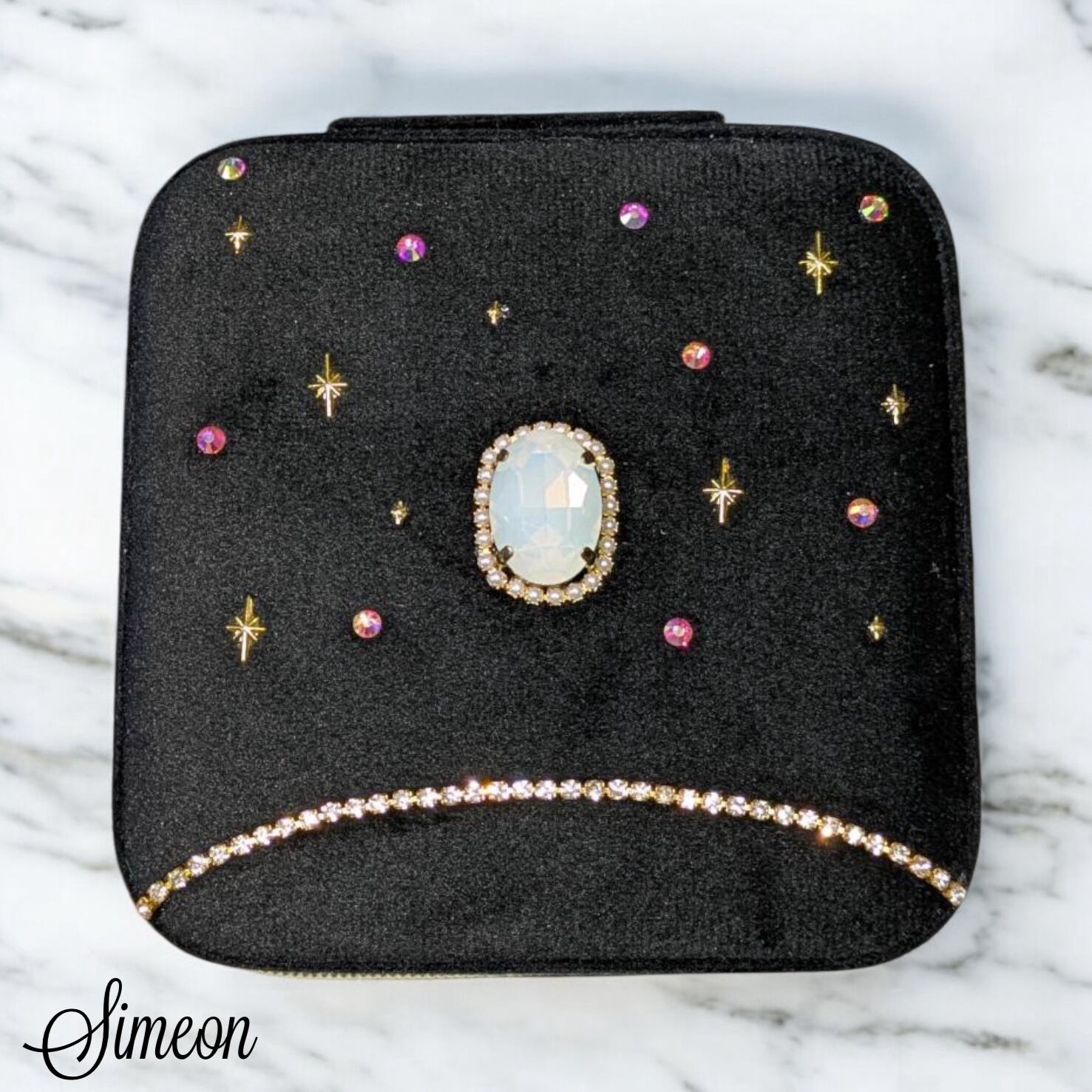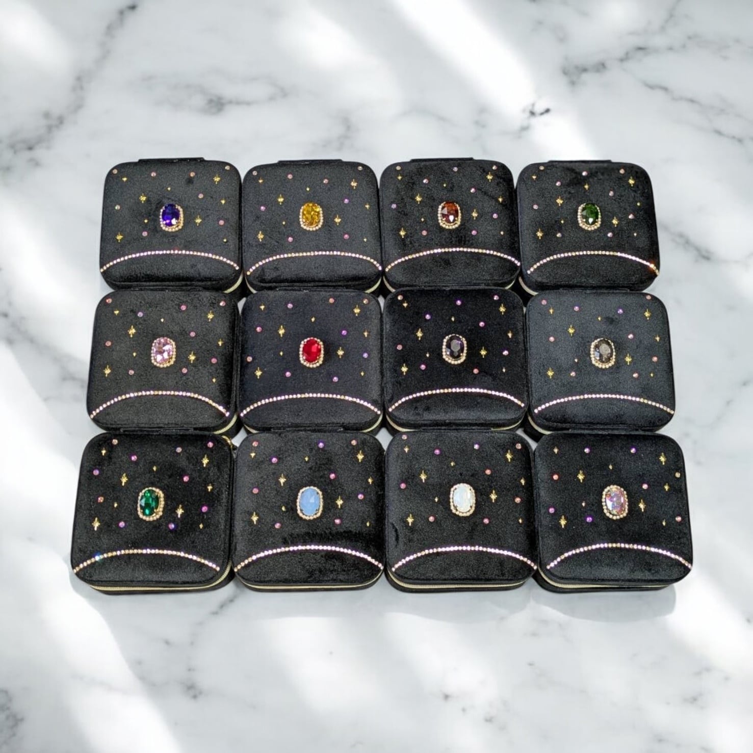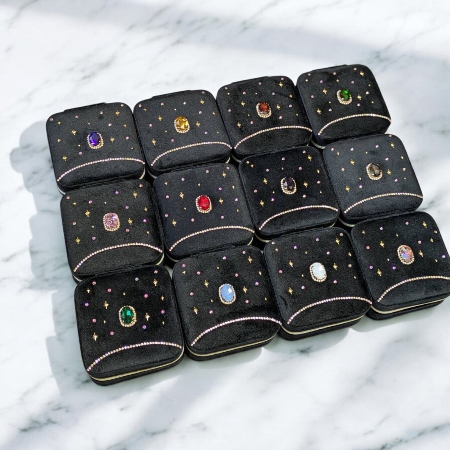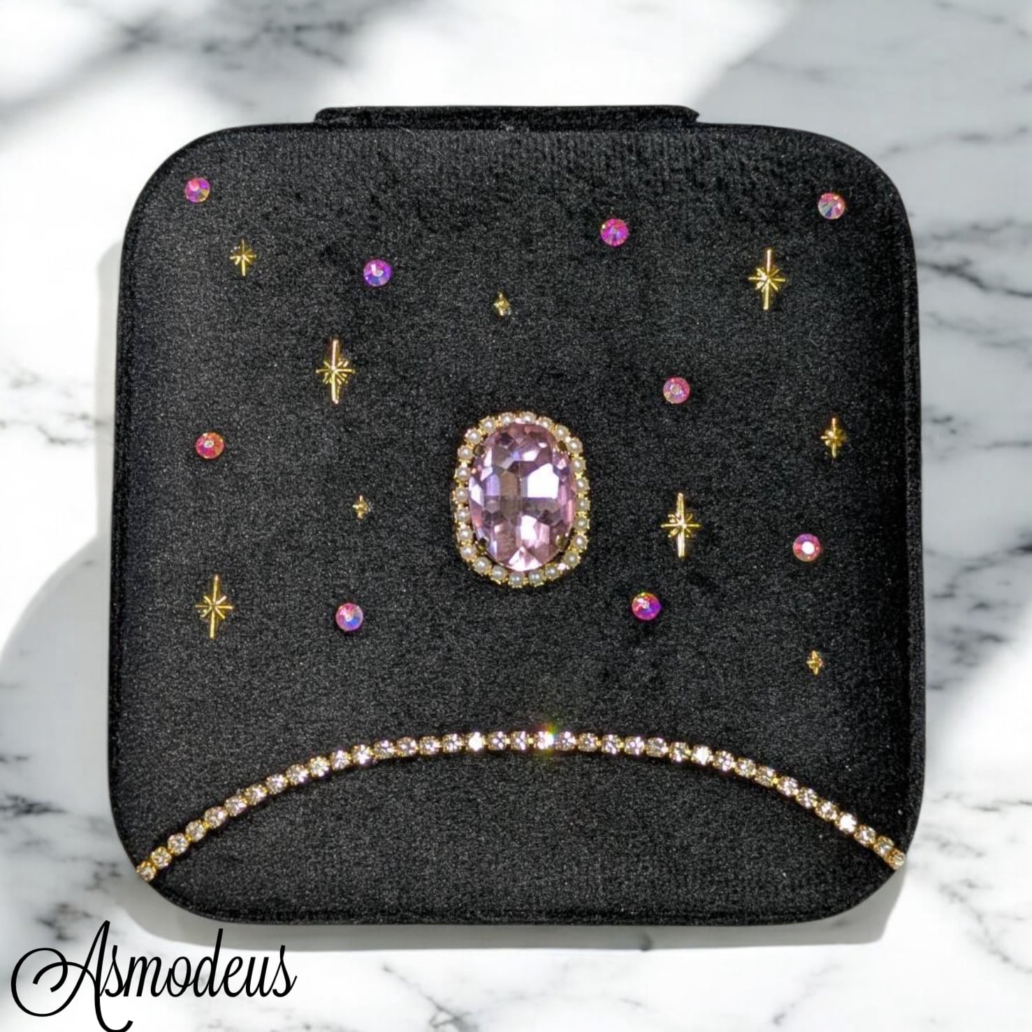 ピルケース・ミラーと同シリーズとなり、ガラスストーンを中央にあしらったベロア生地のケースに、3種類のフラッシュスターとオーロラ加工のストーンを散りばめ、大人可愛いキラキラ輝くケースに仕上げました。