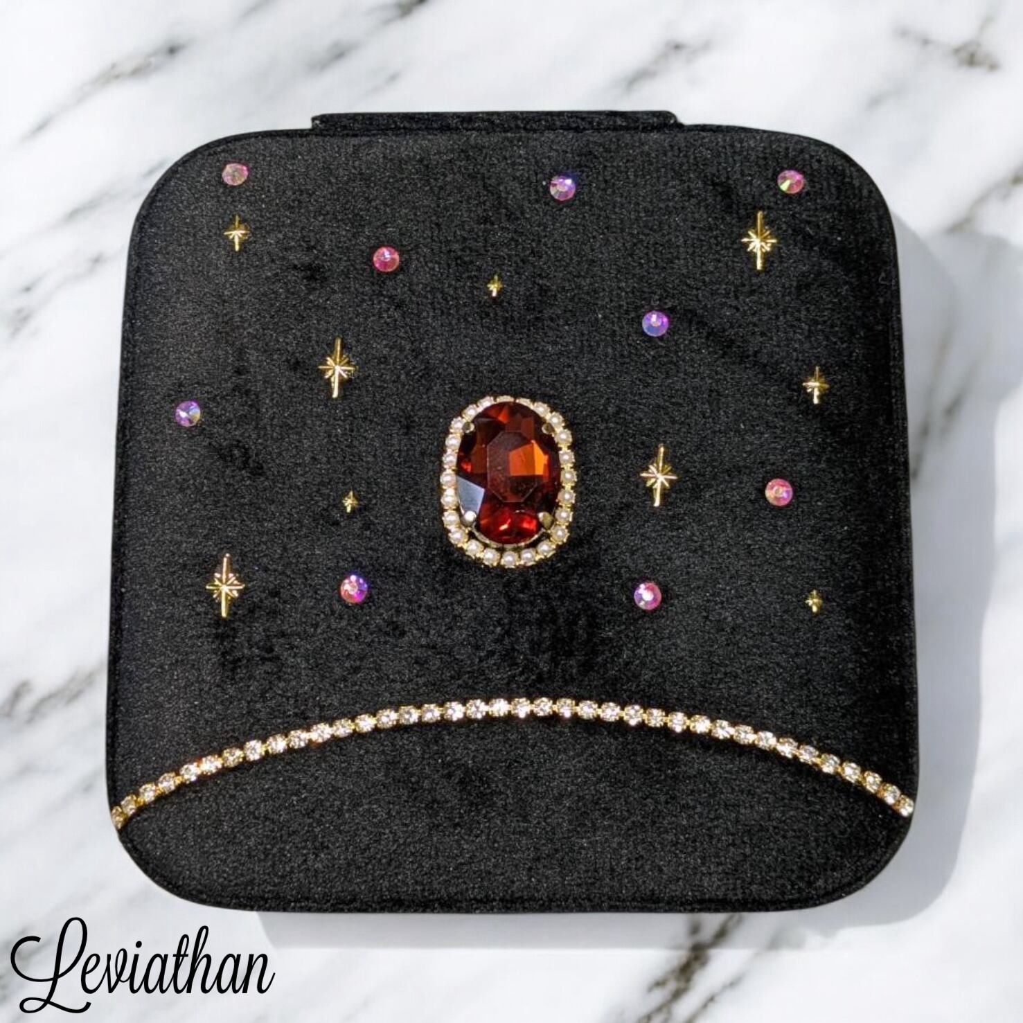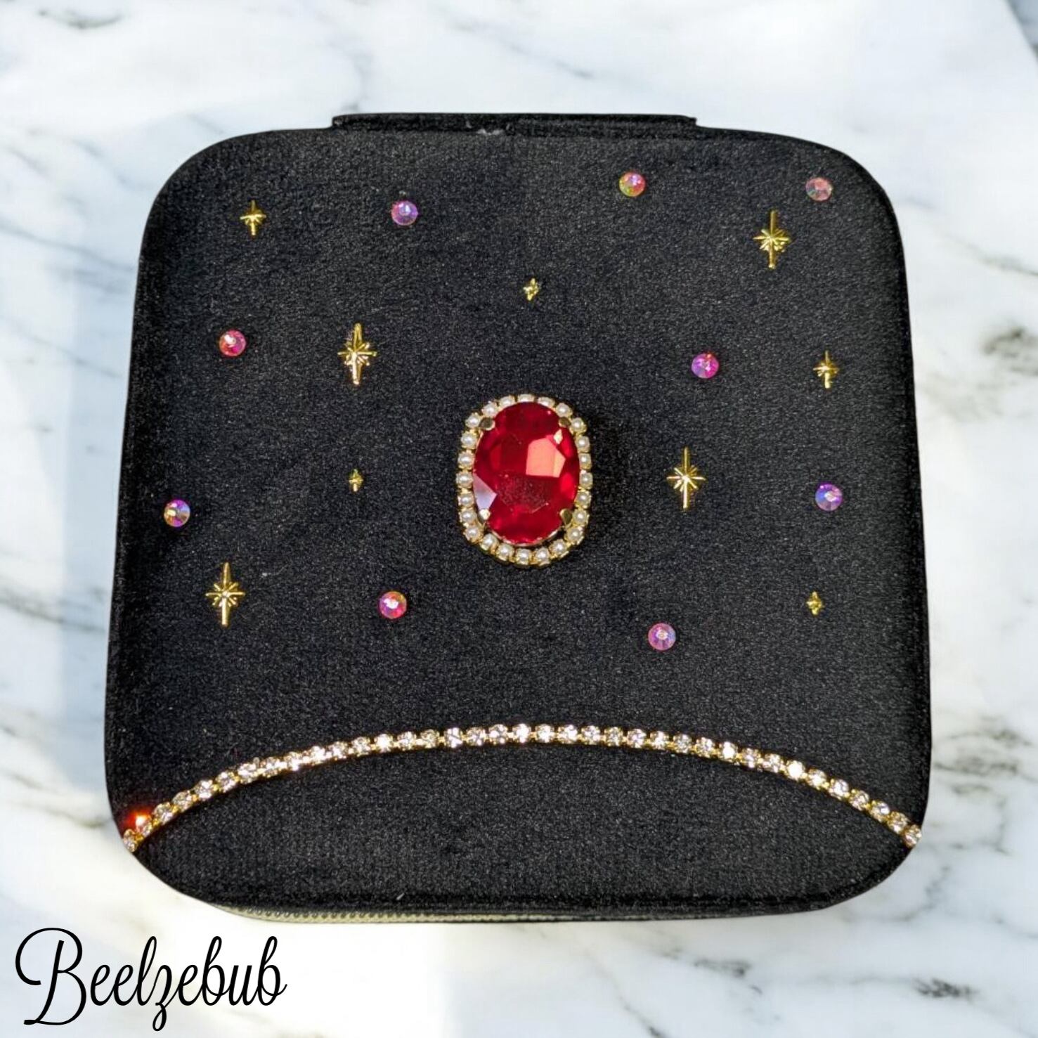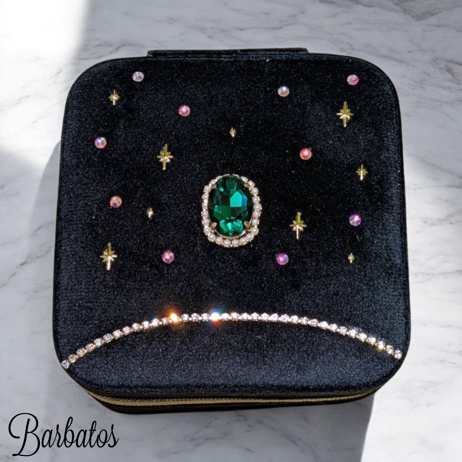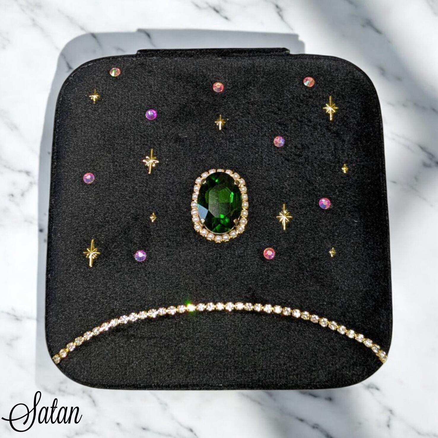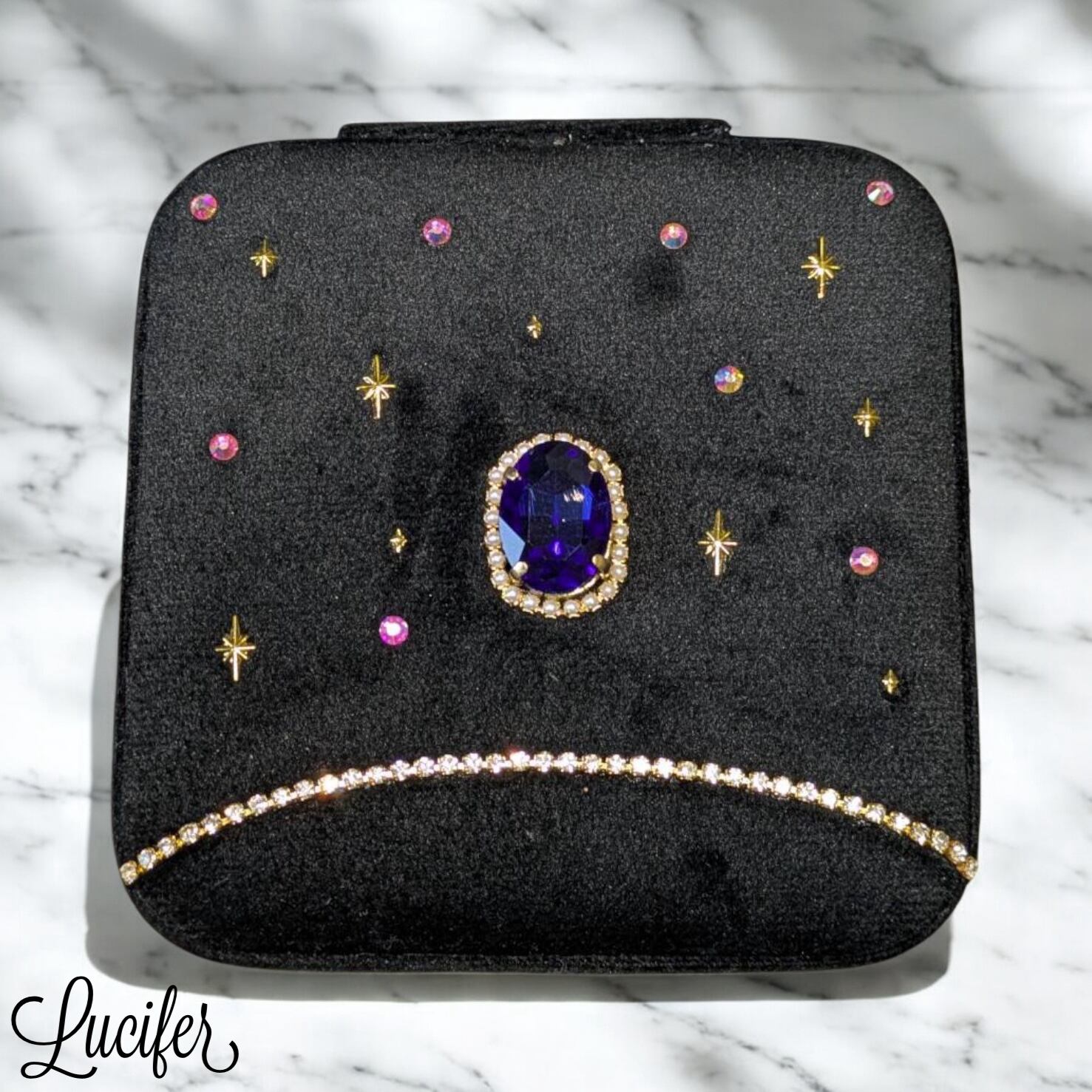 ピルケース・ミラーと同シリーズとなり、ガラスストーンを中央にあしらったベロア生地のケースに、3種類のフラッシュスターとオーロラ加工のストーンを散りばめ、大人可愛いキラキラ輝くケースに仕上げました。