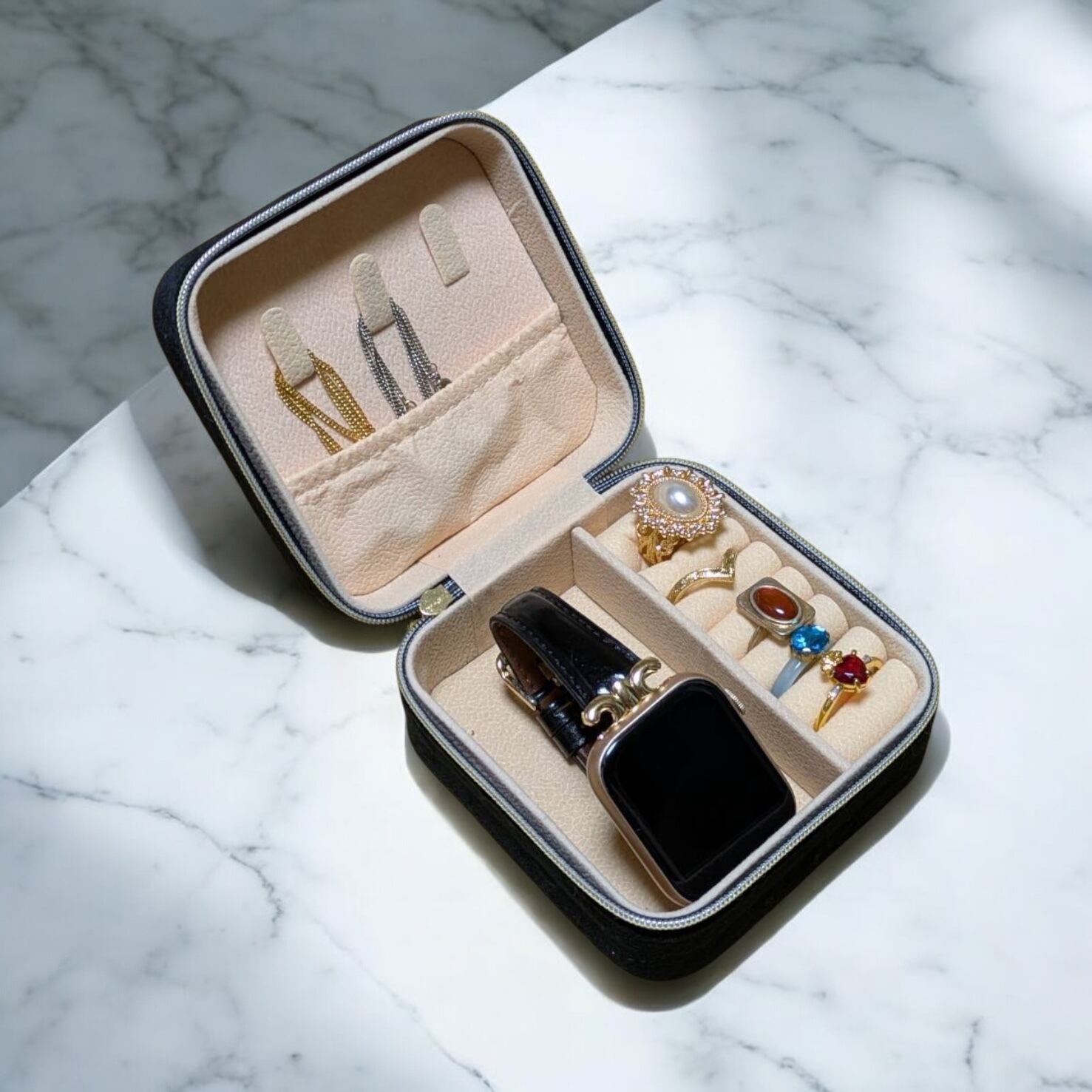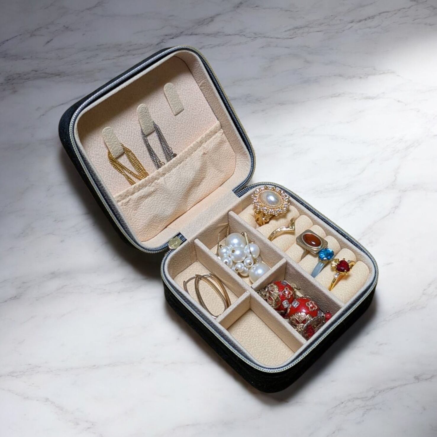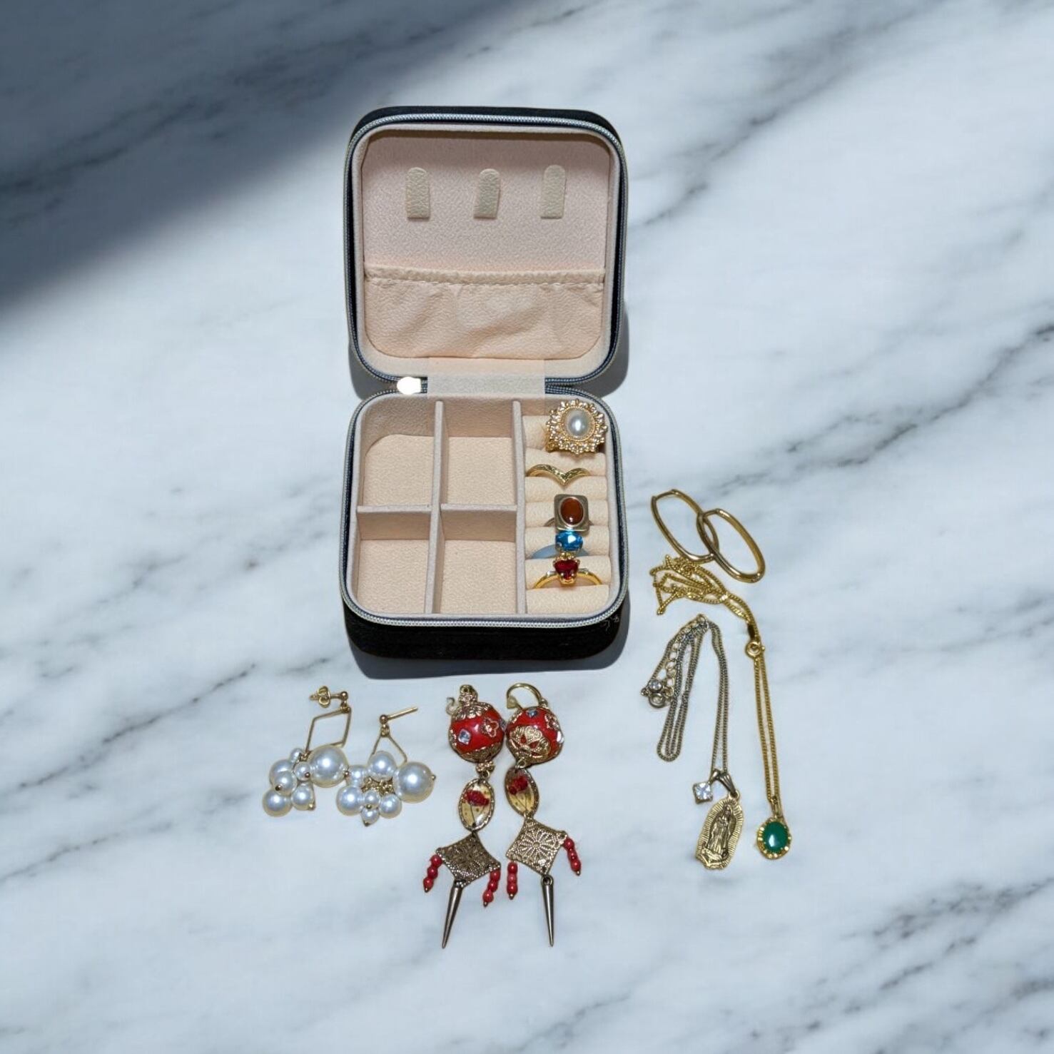 ケースの中にはブレスレット・ネックレスが3点、リングが6〜7点、大ぶりのピアス・イヤリングが4点収納可能。 また十字の仕切りを外せばバングルや時計も収納可能になります。