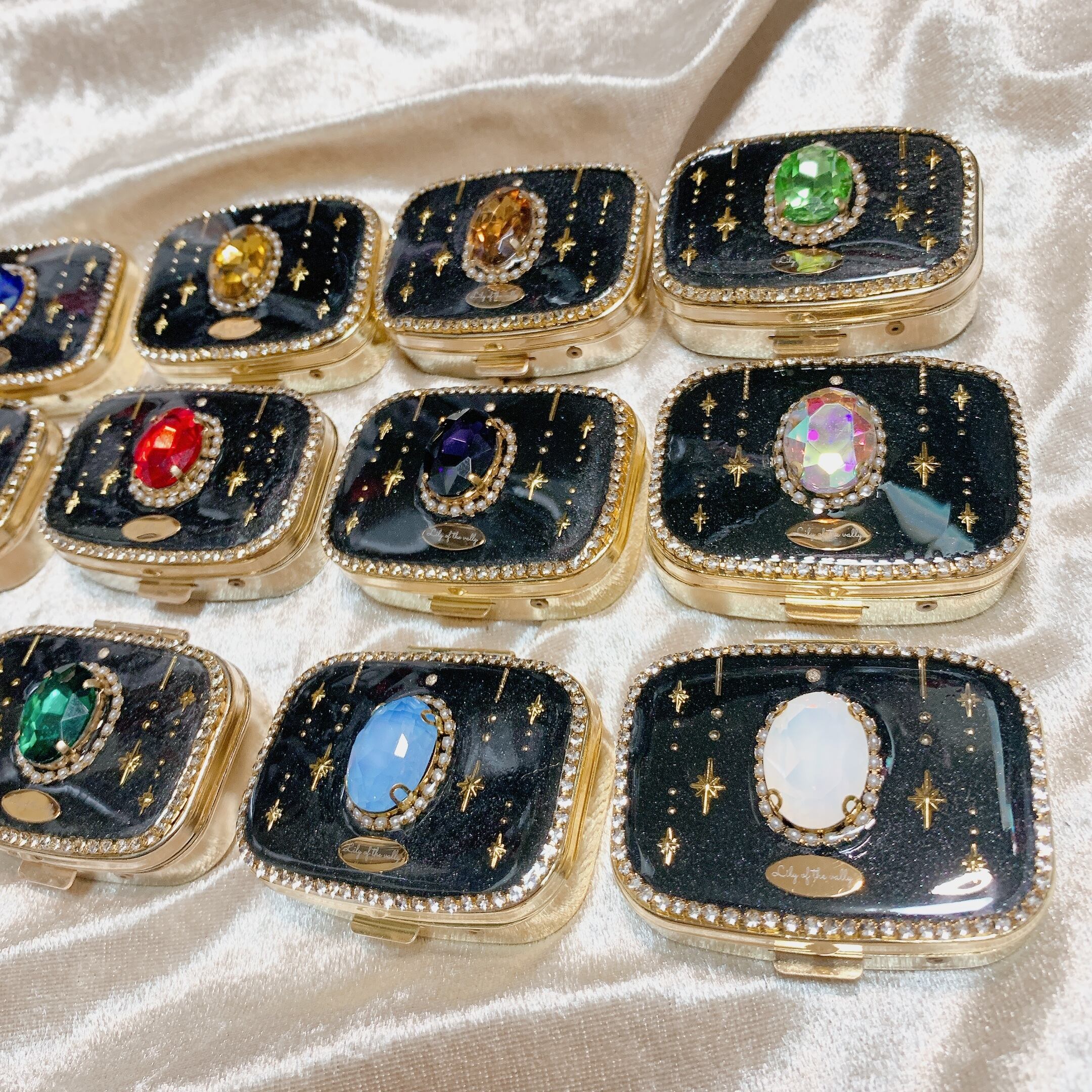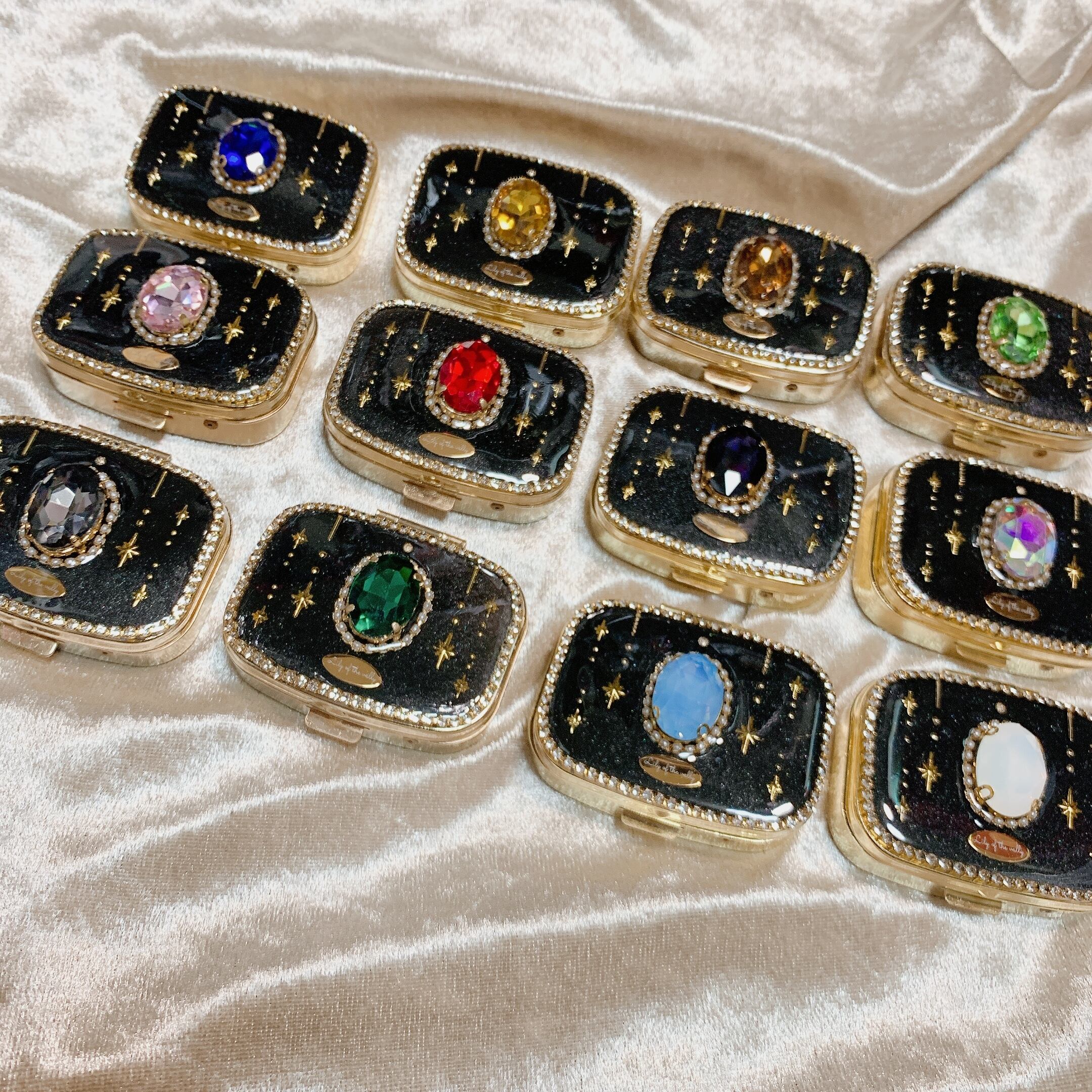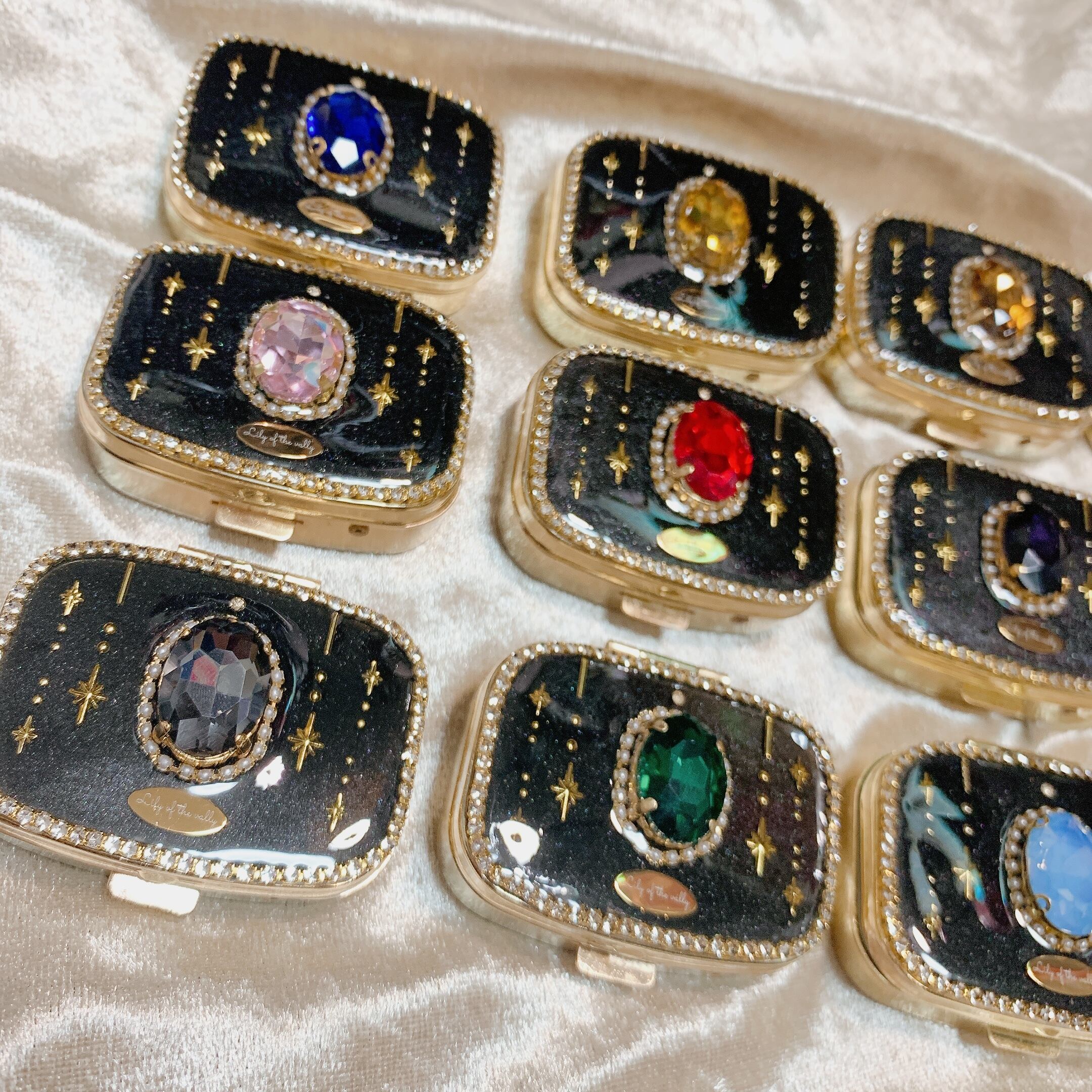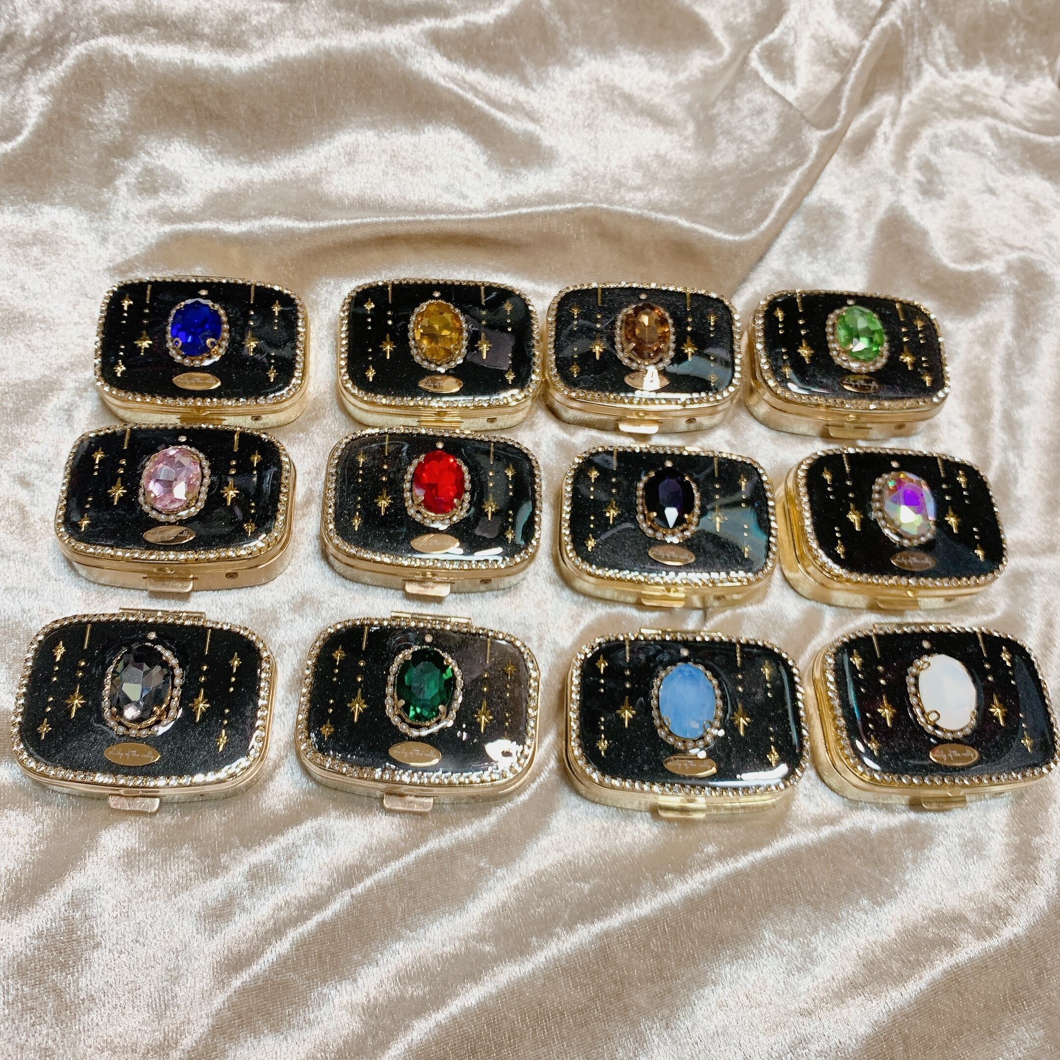 ガラスビジューで装飾されたミラー付きピルケースです。