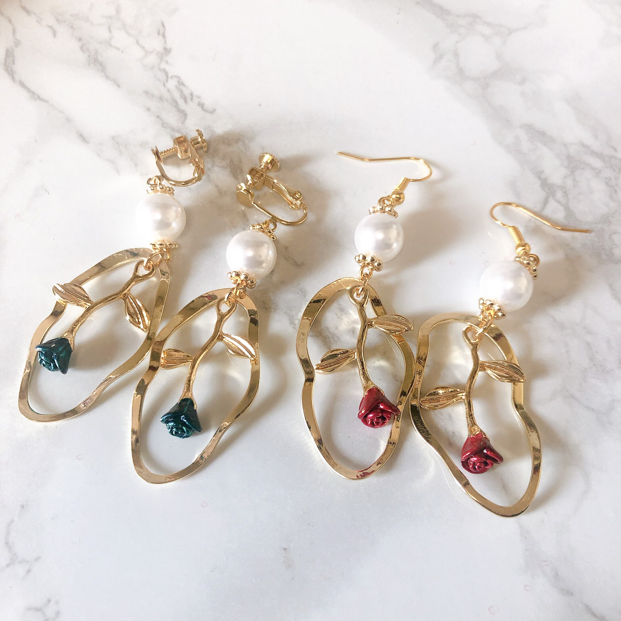 美しいバラのチャームとパールを組み合わせた、エレガントな薔薇パールピアス・イヤリングです。女性らしさを引き立てるデザインは、様々なシーンであなたの魅力を引き出します。